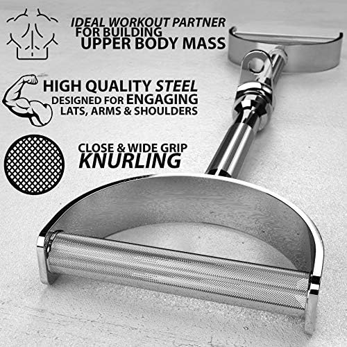 - ★ STRONG & VERSATILE ★ – Our Synergee Pro Style Lat Bar Cable Attachments are made with high-quality steel. On top of that, they are chrome-coated for rust resistance and to increase the longevity of your bar. The knurled outer handles and inner bar provides various no-slip grips to build your lats, traps, rhomboids, and serratus muscles.