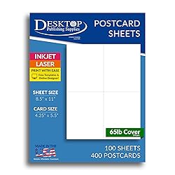 - Desktop Publishing Supplies Brand 65lb White 4up Postcard Sheets make is simple & affordable to create custom postcards from your home or office printer. These high quality postcard sheets are microperforated with 72 perforations per inch for easy breaking apart and cleaner edges. Our Blank white post cards are created to work with the industry standard 4up postcard layout- making them work with virtually all design software! Each postcard measures 4 1/4" x 5 1/2". These postcards are made from a 65lb Cover (176 gsm) Bright White Cardstock that is both inkjet and laser printer compatible.