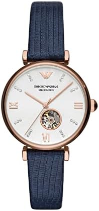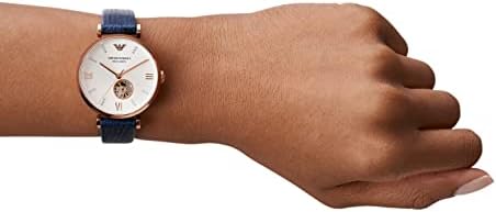 Emporio Armani's 34mm watch features a silver sunray dial with rose gold-tone Roman numeral and stick indexes and see through skeleton subeye, three-hand movement and blue leather strap.