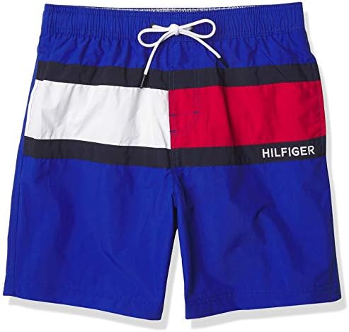 Create a classic beach-ready look in these swim trunks from Tommy Hilfiger. String tie closure and elastic waist. Two side pockets and one back pocket. Classic Tommy branding. Mesh liner.