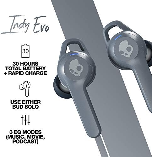 Skullcandy Indy Evo In-Ear Wireless Earbuds, 30 Hr Battery, Microphone, Works with iPhone Android and Bluetooth Devices - Grey