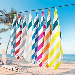 80% Polyester 20% Polyamide SAND FREE MICROFIBER BEACH TOWEL: Sand free beach towel made from high-quality microfiber repels sand so it does not stick. Sand resistant microfiber beach towel easily shakes clean to keep sand out of your bag, car, and home. Soft, durable, and comfortable adult beach towel for beach, pool, and travel. QUICK DRY & SUPER ABSORBENT: Quick dry microfiber towel absorbs water fast and dries up to 3x faster than traditional cotton towels. Highly absorbent swim towel keeps you warm and dry after swimming. Fast drying beach towel helps reduce odors and dampness during travel and outdoor use. LIGHTWEIGHT & COMPACT TRAVEL TOWEL: Lightweight compact beach towel is thin, foldable, and packable for easy travel. Portable travel towel fits easily in backpacks, totes, suitcases, and luggage. Includes mesh carrying bag for convenient storage and portability. MULTI-USE BEACH, SWIM & CAMPING TOWEL: Large microfiber beach towel works as a beach towel, swim towel, pool towel, picnic blanket, yoga mat, gym towel, shower towel, camping towel, and travel towel. Features a hanging loop for easy drying. Ideal gift for beach lovers, travelers, swimmers, and outdoor enthusiasts. STRIPED CABANA BEACH TOWEL: Microfiber quick dry sand free towel features a classic striped cabana design. Stylish adult beach towel for beach, pool, resort, cruise, and vacation use. Machine washable towel made of 80% polyester and 20% polyamide. Size options: 60 x 30 inches and 78 x 35 inches.