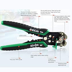 - Size:Wire Stripper IMPORTANT: Mainly apply to strip sheath wire, core wire and multiple strand sheath line. Also wire cutting, bare terminal and insulation terminal crimping. Notice: It is not suitable for special wire, including very thick wire sheath, very tough wire, anti-freezing line, anti-high temperature line and insulated wire. --Without spring STRIPPING WIRE: Strip wire from 8 to 26 AWG (0.13-10.0mm²) with our self-adjusting mechanism. CRIMPING: Crimp AWG 10-22 (0.5-6.0mm²) terminals, and 7-8mm ignition terminals(spark plug). About Price: LAOA TOOLS, Concern on quality - Worth to trust! Every product, be quality! About Received Products: 1.After receiving the parcel.If there is any quality problem, please tell us immediately. We will help you solve it. 2.If you are satisfied with our products.Please give us a good feedback. This is our biggest encouragement. Thanks a lot!
