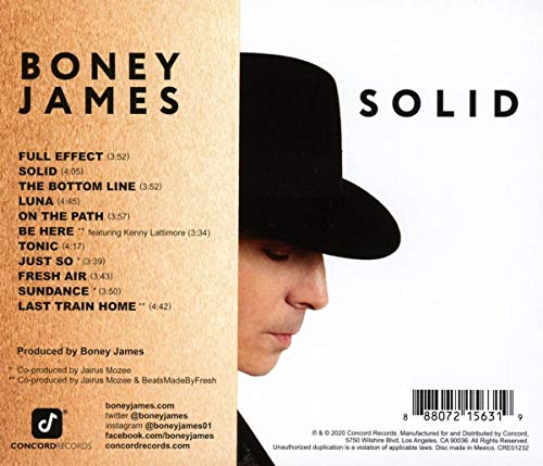 SOLID multiplatinum-selling saxophonist Boney James' seventeenth album. Follows up his smash 2017 release Honestly. Features 11 original songs, with R&B star Kenny Lattimore on the single "Be Here". On the uplifting collection's title, James says "This new music is a reaction to how stressful the world feels these days. Music is a respite, it's always `solid' and it never lets me down. A solid relationship is when someone has your back and will stand by your side no matter what."