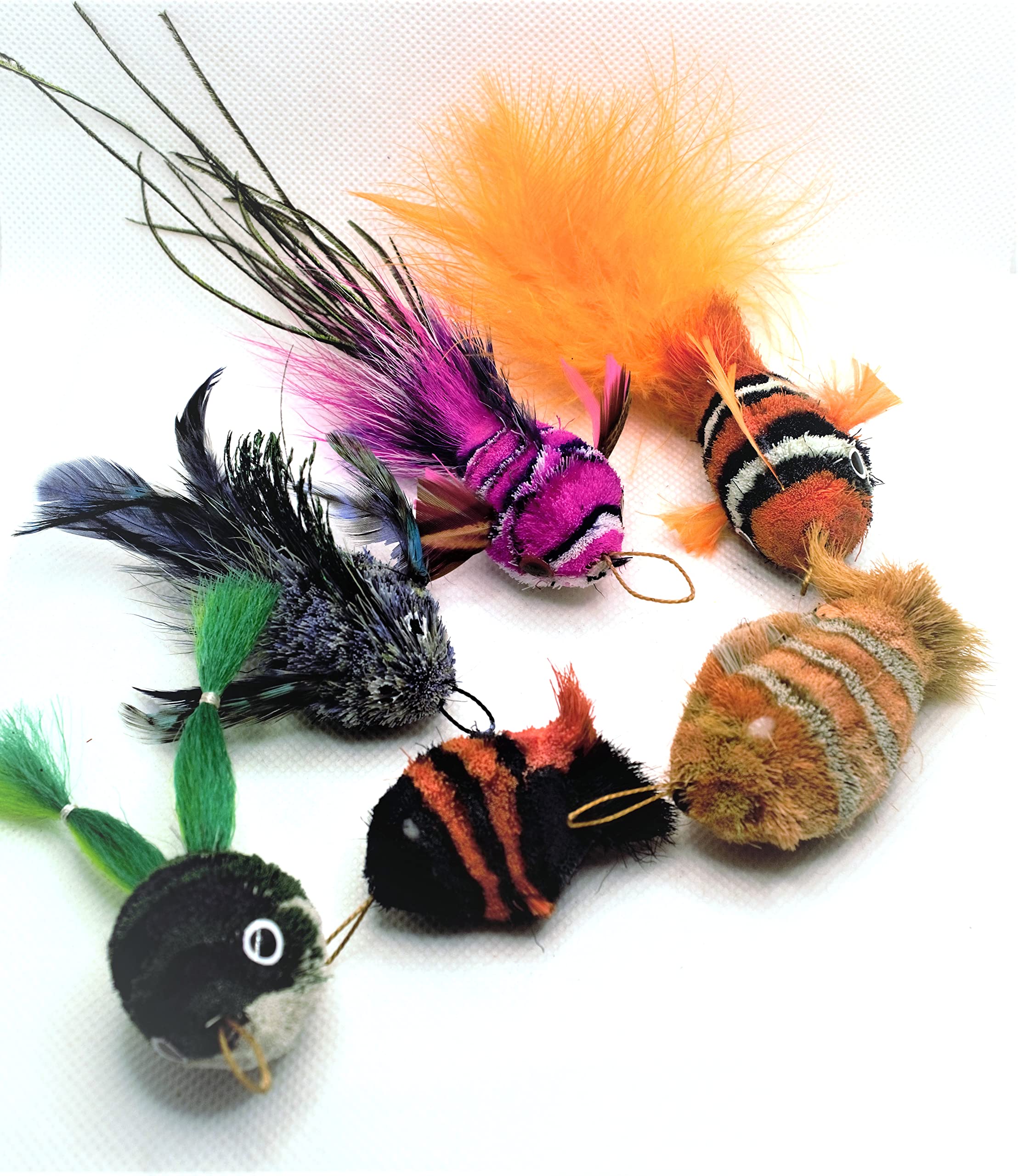 Listing is for a Qty of 3 Litterboy Colored Flies- colors will vary Really brings out the natural hunting instinct of your Cats Adds variety to your Cats Wand toys Colors / Patterns are Assorted - Made from wool and feathers Compatible with the Popular Wand toys that utilize a String or Metal Wire with the swivel connector if you have question about connecting please ask !!