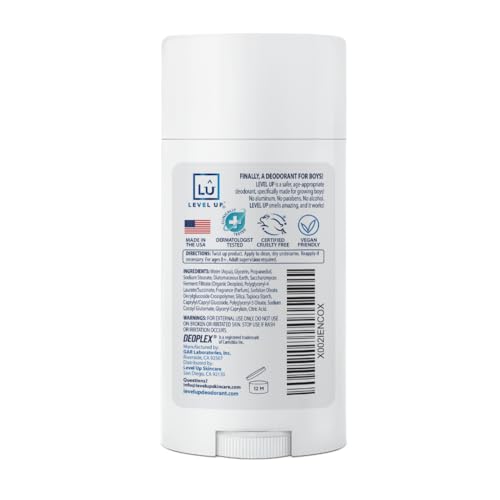 - DERMATOLOGIST TESTED FOR BOYS 8+. LEVEL UP DEODORANT FOR GROWING BOYS, is specifically formulated for young, sensitive skin. 100% NON-TOXIC, Level Up contains NO aluminum, NO parabens & NO alcohol. Level Up was created with safety & health as a top priority.