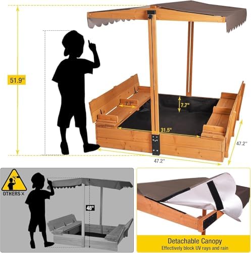 Aivituvin Kids Sand Boxes with Canopy Sandboxes with Covers Foldable Bench Seats, Children Outdoor Wooden Playset - Upgrade Retractable Roof (47x47Inch)