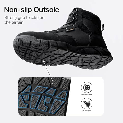 - DURABLE & PROTECTIVE - This mens hiking boots upper made of suede leather with 1000D Cordura fabric, which is durable and scratch-resistant. EVA midsole, lightweight and flexible, supply excellent cushioning for work or hiking. All terrain outsole, great grip with geometrical pattern design, non-slip work boots for men. Strengthened toe cap and heel provide full protection, anti-collision and ankle support. Suit for tactical, military, combat, hunting, motorcycle, airsoft boots