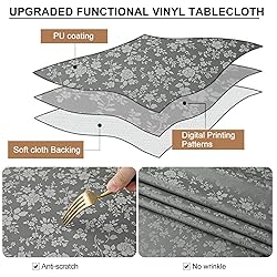 [Elegant Vinyl Tablecloth] Featuring floral embossed tablecloth with pretty scalloped edges, nice warm tone and soft touch add an elegant touch to these tablecloths, they are suited for light up your fancy dinner. [Waterproof and Reusable] Made of premium Polyurethane (PU) with a 3 layer thickening technique, it is waterproof, incredibly soft, and reusable enough to withstand daily spills and scratches. [Easy Cleaning] The surface of the Smiry tablecloth is impervious to water and spills, allowing you to effortlessly wipe away liquids with a damp cloth or napkin. For thorough cleaning, simply toss it in the washing machine with cold water and then dry it on a gentle cycle or under the shade. [No Slip and Nice Drape] Our vinyl tablecloth boasts a thicker build to withstand tearing and abrasion, making it a reliable choice for daily use. Additionally, its substantial weight ensures that it drapes beautifully and stays securely in place on the table. Tip: the wrinkles from transportation will easily disappear after washing and ironing. [Multiple Uses] Smiry offers a range of tablecloths in different sizes and vibrant colors, fits various shapes of tables (rectangle, oval, and square); suit for any holidays, casual dinner or a formal event, creates a warm and festive setting in indoor or outdoor use!