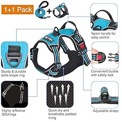 - Features: >No pull and no choke: Specially designed with 2 strong metal delta shape rings for safer dog walks. Chest attachment clip to stop your dog from pulling on walks, perfect for dog training or dogs who tend to pull. The back one is great for casual walks, jogging, hiking, etc >Easy to use and locking security: Size adjusting easily, quick snap buckles let it put on or take off the dog harness conveniently, the safety lock ensuring 100% no accidental detachment. >Durability: Made of High-density nylon webbing, durable nylon oxford, strong buckle and stainless metal delta shape ring. >Easy cleaning: Machine washable and quick dry. All metal accessories are rust-proof. >Reflective: Reflective stitching maintains high visibility at night for safety. >Strong 5ft dog leash: A strong 5ft dog leash with foam handle for firm and comfortable grip and preventing your hand from leashburn! Package Include: 1 x dog harness (color: Blue size: L) 1 x dog leash (color: Blue size: 5ft) Size specification Size S: neck girth: 13“-18” chest girth:17.5”-22” Size M: neck girth: 14.5“-20.5” chest girth:22”-28” Size L: neck girth: 18“-25.5” chest girth:24.5”-33” Size XL: neck girth: 21.5“-33” chest girth:30”-39.5” Important notice: Please measure your dog’s neck and check girth carefully before purchasing. DON’T only choose the size only according to your dog’s weight or breed.