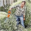 Wireless shears with shrub and lawn trimmer attachments. Shrub trimmer for optimised Stihl cutting geometry for optimised Stihl cutting geometry when cutting small evergreen hedges and cutting small leaf ornamental trees up to 8 mm branch thickness. Trimmer attachment for edging around small lawns, porch and flower beds. Convenient rubber handle, fast, tool-free blade change and battery charge level indicator, so you can always keep an eye on the remaining battery capacity. 2 batteries only work with the products in the system and are not compatible with HSA 25.