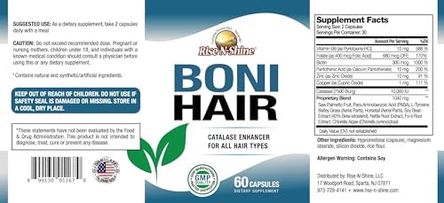 Rise-N-Shine BoniHair Catalase Supplement for Vibrant, Youthful Hair Support - 10,000 IU Catalase with Saw Palmetto, Biotin, Fo-Ti, PABA - 60 Capsules