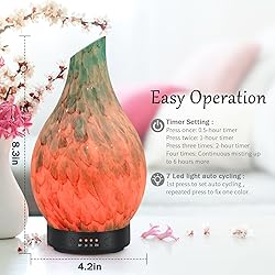 - Product Description The diffusers for essential oils are widely used at home, office, spa, bedroom, living room, bathroom, yoga studio and the like. Function: Beauty: refresh skin, keep skin healthy and moist. Humidification: humidify and refresh the air in a room. Relief: aroma therapy, relieve stress. Specification Cover Material: Handmade Glass. Water Tank and Base Material: PP ABS, BPA Free. Product Size: 24cm*12cm Product Weight: 1.5 lb. Capacity: 120ml. Mist Mode: Continuous mist mode and time setting (0.5 H, 1 H, 2 H, continous misting mode). Work Time: 3-5 H. Advanced Ultrasonic Technology: 2.4 MHz Standard: US Plug Waterless Auto-Off Function Application: Beauty salon, Bedroom, Living room, SPA, Yoga, Conference room, Office, Reception center, baby room, Hotel, Hospital or any other private and public circumstance. Package Includes: 1 x Aroma Essential Oil Diffuser (Essential Oil is not included) 1 x User Instruction Manual 1 x Power Adaptor Note: 1. Do not open the diffuser cover when using. 2. Please add water below the max line (less water, more mist). 5-7 drops of essential oil (essential Oil is not included). 3. After 7 times or 7 days using, please use cotton swabs to clean the middle hole of the water tank.