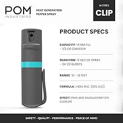 - POM Pepper Spray Clip and Keychain Combo Pack – Two Types of Carrying Option – Traditional Keychain Model plus Pocket Clip Model brings you more options! Our focus is on Safety, Design and Functionality. POM’s design – Our patented flip flop top provides optimum safety and ease of use - No accidental discharge, and always ready to fire. Our formula POMClear is the strongest OC formulation legal to carry in the U.S. - 0.5 oz unit provides up to 25 powerful bursts, up to 10 seconds of continuous spray, and can be shot at a 10-12 foot range. POM uses an Independent High Pressure Liquid Chromatography (HPLC) laboratory to ensure each batch of units measures at the same consistency and heat.