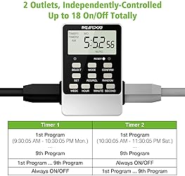 2 Independently-controlled Outlets:This 3-prong timer outlet can control different appliances independently at the same time. Dual grounded outlets make it equal to 2 single-outlet timers Up to 18 ON/OFF Programs: The outlet timer offers up to 18 individual schedules to turn on/off electronics automatically. The 7-Day programmable timer switch also provides up to 15 choices for week setting Easy to Program: This digital light timer allows extremely convenient and flexible time setting for week, hour, minute and second directly, super easy to understand and apply, fully meet your needs. And the Min setting time is as precise as 1 second Multifunctional: 12/24 Hours System to show AM/PM conveniently. Daylight Saving Time just one step. Random Vacation Mode to make your home look “lived in” even when you’re away, thus protecting your home from thieves. Child Lock Function to protect saved programs Widely Used: NEARPOW 3-prong grounded timer outlet, easily program, ideal for all kinds of electric pumps, lights, cooling and heating systems, indroor sprinklers, humidifiers, aquariums, nebulizers, ventilators and more