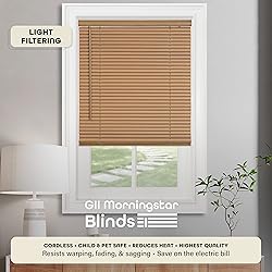- The Cordless GII Morningstar blind provides light filtering and privacy. It is made from heavyweight PVC engineered for privacy and resists warping, fading and sagging. The modern style features a tilt wand and cordless lift. Child & Pet Safe! To Operate: Simply lift or lower bottom rail to raise or lower blind, Control how much sunlight streams into your room by twisting the wand to open and close the slats. Hidden mounting brackets are designed for inside, outside or ceiling installation. All hardware and installation instructions are included. This blind will fit windows 3/8” (0. 95 cm) smaller and ½” (1. 27 cm) wider than stated size. This actual blind is ½ “ (1. 27 cm) narrower/smaller than stated size. Actual Slat size is 1 inch.