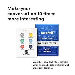 - Build Authentic Connections The BestSelf Deeper Talk conversation cards for friends deck is designed to inspire genuine relationships and meaningful conversations. Featuring 170 thoughtfully curated prompts, this card deck fosters open communication, vulnerability, and trust. Perfect for friends, family, coworkers, or dates, it breaks communication barriers and helps cultivate lasting bonds. Adaptable for Any Setting With six categories—Courage, Beliefs, Life Lessons, Self-Awareness, Dreams, and Exposed—it fits seamlessly into any occasion. Use it for family reunions, team-building activities, date nights, or casual hangouts. From deep insights to lighthearted moments, this deck ensures meaningful conversations for all. What Sets Us Apart This deck goes beyond surface-level dialogue. With 170 unique prompts, it encourages openness, empathy, and genuine understanding. Built for both personal and professional use, it’s the ultimate tool for elevating conversations and creating impactful human connections. Highlights You’ll Love: 170 Curated Prompts: Designed to inspire thought-provoking, impactful conversations. Six Unique Themes: Includes Courage, Beliefs, Life Lessons, Self-Awareness, Dreams, and Exposed. Fosters Stronger Bonds: Encourages openness and trust in all types of relationships. Perfect for Every Occasion: Great for family events, team-building, date nights, or casual get-togethers. Durable & Long-Lasting: High-quality cards built for repeated use and meaningful interactions. For Everyone: Ideal for friends, families, coworkers, and couples. Why You’ll Love It: Deepen Relationships: Build trust, understanding, and closeness with thoughtful conversations. Encourage Personal Growth: Promote self-awareness, empathy, and deeper insights through meaningful dialogue. Versatile & Fun: Perfect for any scenario, helping to create connections and joyful memories.