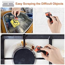2-In-1 Scraper Remover Tool: The time-saving razor scraper tool with both plastic and metal blades can meet your various needs. The plastic blade is sharp but safe and without scratching the surface. The metal blade can remove multiple stubborn stains Let You Clean Comfortably: Our scraper cleaning tool adopts ergonomic curved and anti-slip handle design. It is small and easy to grasp, providing you with good comfort and control. Make your cleaning easier and safer Multifunctional Scraper Tool: This scraper removal tool can be used to remove decals, stickers, glue, labels, paint, Tint from windows, walls, cars, tiles, floors and glass. Also it can remove food residues on the ovens, kitchen cook tops, and glass top stoves Safe Cleaning Scraper Tool: The safety knob on both sides of the scraper, provides the good stability structure. And the double-end scraper is equipped with safety protective covers, which is convenient for storage and prevents accidental cuts to yourself Easy To Use: You only need to loosen the knob on the scraper and disassemble the upper cover to easily replace the blade. Moreover, we recommend that you take extra care when replacing the metal blade