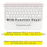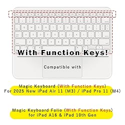 【COMPATIBILITY】Only for Magic Keyboard with function keys. Compatible with 2025 New Released Magic Keyboard (for iPad Air 11 inch M3/ iPad Pro 11 inch M4) and Magic Keyboard Folio (for iPad A16 11 inch/ iPad 10th Gen 10.9 inch). It is US Keyboard Layout. 【Engineered to Fits】It fits each key precisely and is super easy to install and remove for cleaning. 【Full Protection】Daily protection from water spills, dusts, oil and fingerprints. It always keeps the keyboard fresh. 【Exclusive Material】Our EXCLUSIVE lighter and softer material can minimize extra typing resistance that any keyboard cover will bring, avoiding typing fatigue. It is non-toxic, washable and durable. It does not detract the natural beauty of your cute keyboard. 【Satisfaction Guaranteed】With more than 7 years of selling experience, we offer premium and prompt customer service. If you are not satisfied with our product, please contact us. We promise 100% customer satisfaction.