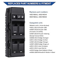 - Obaee Power Window Switch is brand new and durable replacement for your defective window switch at best price. All of the models listed replacement window switches have been 100% factory tested in compatibility. 【Compatible with following vehicles】:(Models With 1 Auto Button)✈ Compatible with Chrysler 200 2011 2012 2013 ✈ Compatible with Chrysler 300 2007 2008 2009 2010 (Includes C & SRT8)✈ Compatible with Chrysler Sebring 2007 2008 2009 2010 (Except Convertible) ✈ Compatible with Dodge Avenger 2008 2009 2010 2011 2012 2013 ✈ Compatible with Dodge Caliber 2011 2012 ✈ Compatible with Dodge Charger 2007 2008 2009 2010✈ Compatible with Dodge Magnum 2007 2008✈ Compatible with Jeep Compass 2011 2012 2013✈ Compatible with Jeep Patriot 2011 2012 2013✈ Compatible with Mitsubishi Raider 4-Door 2006 2007 2008 2009✈ Compatible with Dodge Dakota 4-Door 2010 【Features】:➤Comfortable touch feeling➤Directly plug and play style➤High quality OEM replacement part➤Material: ABS plastic & PP plastic 【Replaces Part Numbers】:4602780AA, 4602780AB, 56040691AD, 56040691AC, 901-459 【Package Content】:1 x Power Master Switch 【Purchase Without Worry】: Obaee power window switch provides lifetime warranty. If the switch ever malfunctions on your vehicles contact us for a free replacement.