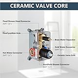 【All Metal Material & Durability】: This shower head set is made from SUS304 stainless steel (12-inch shower head, handheld spray, shower arm, bracket holder, hose, and cover plate) and brass (valve body). It offers rust, corrosion, and high-temperature resistance. Built for daily use in bathroom environments, it ensures long-lasting durability. 【Dual Functions】 :This shower system has 2 functions, 12 inch ceiling mount rain shower head (can be adjustable for different angle and also water comes down from like natural rainfall ) and handheld spray with 59 inch shower hose (easy to clean bathroom corners), flexible mode switching, meeting diverse needs such as full-body showering and precise cleaning. 【Easy Installation】: This shower faucets sets complete comes with all necessary installation hardware, including a pre-installed valve, shower arm, shower hose, and bracket and installation manual. Compatible with standard 1/2-inch NPT interfaces (U.S. standard), its ceiling-mounted design is suitable for bathroom renovations and new construction, also doesn’t take up wall space, can creates clean and minimalist look. 【Housing Valve Body】: This brass valve body comes with a protective housing aims to prevent dust and moisture to extend the lifespan. The housing depth is calibrated for standard finish wall with tiled installation -embedded depth for the valve body, making it easy to position the valve accurately during installation. 【Water-Efficient Design】: This shower faucet set features air-injection technology to boost water pressure, paired with ceiling mounted showerhead that provides rainfall-style water flow. Single handle operation can be easy to control water temperature and flow.The water-efficient design helps reduce water consumption during use.