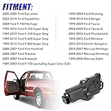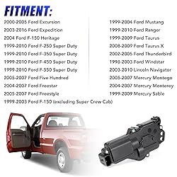 Replacement Door Lock Actuator: Power Door Lock Actuator is for locking and unlocking the doors of a vehicle. If you suspect that your door lock actuator is not working correctly, it should be replaced timely to ensure proper operation of your vehicle's locking system Fitment: The door lock actuator compatible with 1999-2003 Ford F-150 (excluding Super Crew Cab), 1999-2016 Ford F250 F350 F450 F550 Super Duty, 2000-2005 Ford Excursion, 2003-2016 Ford Expedition; 2003-2010 Lincoln Navigator, 2005-2007 Mercury Montego, 2004-2007 Mercury Monterey. 2001-2009 Mazda B2300 Replace Part Number: Driver Side Actuator: 6L3Z25218A43AA, 6L3Z-25218A-43AA, 1F7058360, 746-148, 746148; Passenger Side Actuator: 6L3Z25218A42AA, 6L3Z-25218A-42AA, 1F7058350, 746-149 Premium Performance: Superior door lock actuators are made from durable materials and designed to function properly within your Ford, Mazda, Mercury & Lincolnji vehicles, years including 1999, 2000, 2001, 2002, 2003, 2004, 2005, 2006, 2007, 2008, 2009, 2010, 2011, 2012, 2013, 2014, 2015, 2016 Package Content: 2 Pack Power Door Lock Actuator; If you have any issues or problems about the door lock actuator please reach out to us anytime
