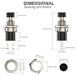 - DIYhz Push Button Switch Product parameters: - Poles: SPST. - Terminals: 2 Pin. - Material: Plastic, Metal. - Action Type: Momentary. - Rating Voltage: AC 250V / 1A. - Contact Type: NC (Normal Closed). Product Specifications: - Pin Pitch: 3mm / 0.11". - Cap Diameter: 6mm / 0.24". - Thread Diameter: 6.9mm / 0.27". - Overall Size: 25 x 9mm / 0.98" x 0.35" (Max. L * D). Product Features: ✔DIY for refrigerator car circuits and laboratory enthusiasts ✔The push button switches are used in industrial controlling circuits ✔for controlling in electromagnetic starter, contactor, relay and other electric circuits. Warm Tips: Choose the appropriate electric soldering iron, and speed up the welding speed. It is recommended to use 20W electric soldering iron to complete the welding in three seconds. The flux must be the right amount. And try to turn the pins of the switch down when welding. In addition, it would be better to use plug wire with terminal, such as pins with spring, auxiliary plug and try to avoid direct welding. Package Content: 10 x Push Button Switches.