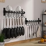 【Decorative】 The kitchen utensil hanger comes in beautiful quality and color, simple and stylish, adding an elegant look to your space. 【Durable】The pot and pan rack is made of premium stainless steel and can hold up to 22 pounds. 【Different Use】 With a flexible size of 16 inches long, you can use it anywhere, such as on the cabinet, next to oven or stove, above the sink, coffee station, kitchen island, utility closet. Easy to install, sizes(inches): 15-3/4 L x 3-3/8 H x 1-5/8 Deep, including 2 x kitchen rails with 8 hooks, mounting hardware, black color, 【Space Saver】This utensil holder rail with 8 hooks fits perfectly on wall freeing up counter or cabinet space, allowing easy access to pots, pans, spoons, mugs, cups, cooking utensils, In addition, it can also a great organizer for brooms, dusters, mops, belts or jewelry.