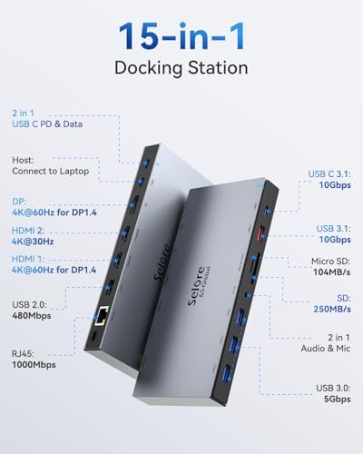 - Estación de acoplamiento eficiente para monitor dual: La estación de acoplamiento Selore se conecta a puertos HDMI duales para disfrutar de una transmisión clara o espejo en dos pantallas con hasta una resolución de 2K a 60Hz en laptops DP 1.4, o hasta 1080p a 60Hz en laptops DP 1.2. *Nota: Los sistemas macOS no admiten el modo de extensión de monitor dual, solo pueden extender una pantalla con monitores conectados en modo de extensión