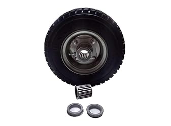 - This is a no flat solid puncture proof tire size 9x3.5-4. Fits part numbers 72410088, VKXWHEEL, and 10816. Compatible with the two wheel Velke system, not for the single wheel system. Included inside the rim is one roller bearing and two bearing retainers. The roller bearing fit part numbers 77410031 and VKXRLBRG and the bearing retainers fit part numbers 77410030 and VKXBRGRTNR. Hub length: 2 1/4" offset, Tread: traction, Type: solid foam, no flat, comes with a grease zerk. Flat free tires provide the bounce and load handling characteristics similar to an air-filled tire with the benefit of never going flat.