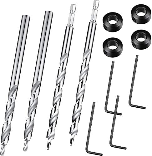 Broca de bolsillo de 3/8 pulgadas de 4 piezas con cuello de tope de profundidad, vástago hexagonal de 1/4 y vástago redondo, brocas helicoidales de repuesto para sistema manual de guía de orificios de bolsillo (6.3 pulgadas de largo)