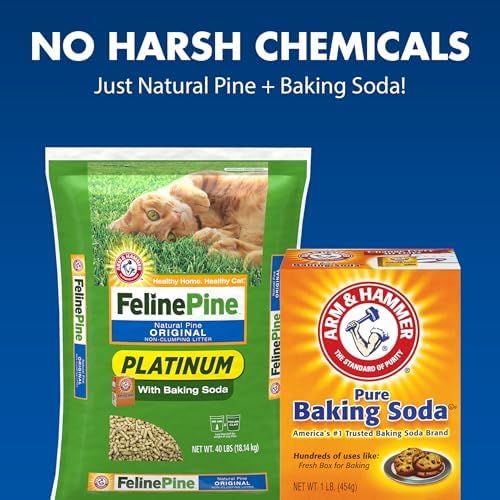 Odor control is important when it comes to your cat’s litter box, but you want and a natural option for your feline companion is ideal. Feline Pine™ Platinum is a natural pine non-clumping litter that serves as a cat litter deodorizer without harsh chemicals, added fragrances, or synthetic perfumes. It naturally neutralizes odors in your kitty litter box because it’s made from natural, plant-based ingredients like natural pine shavings plus pure ARM & HAMMER™ Baking Soda. It’s This wood cat litter is responsibly made from highly absorbent, sustainably sourced natural pine shavings only from reclaimed lumber (no new trees cut down) that neutralize odor on contact and are gentle on kitty’s paws. This plant-based kitten litter binds directly to ammonia odors and locks them away for good. It’s also a low dust free cat litter and lightweight—less than half the weight of clay litter and leaves no messy cloud of dust. Ideal for cat owners and pet caregivers, this ARM & HAMMER cat litter fits into daily maintenance and pet care routines, maintaining litter box freshness and preventing odor build-up in indoor litter setups and residential pet areas. Perfect for use with litter box accessories like cat scoopers and litter mats.