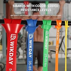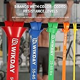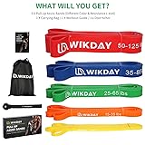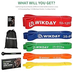 - With WIKDAY Resistance bands set, you can perform resistance band exercise anytime and anywhere, easy to carry, home, gym, outdoor, office or even on the go; your all in one rehabilitation mobility and exercise bands. Material:Environment-friendly natural latex materials, Non-toxic, no odor, anti-slip and curled. 5 Different Levels:Yellow Band: 81.9 x 0.26 x 0.2 inch / 2.04 oz / 8-15 lbsOrange Band: 81.9 x 0.52 x 0.2 inch / 3.57 oz / 15-35 lbsGreen Band: 81.9 x 0.9 x 0.2 inch / 6.6 oz / 25-65 lbsBlue Band: 81.9 x 1.2 x 0.2 inch / 9.6 oz / 35-85 lbsRed Band: 81.9 x 1.8 x 0.2 inch / 13.56 oz / 50-125 lbs WIKDAY Professoinal resistance bands of 5 different levels Yellow(8-15llbs):Low resistance for warm-up ,stretching and yoga .Suited for beginners and teenagers,suited for speed training .Red (15-35lbs): Low resistance for warm-up, stretching and light strength training. Perfect for shoulder training and other high performance speed training.Black (25-65lbs): Light to medium resistance to mobility exercises and stretching. Well suited for high stretch training / stretching.Purple (35-85lbs): Moderate to severe resistance for moderate fitness exercises and strength training. Also suitable as medium support for pull-ups.Green (50-125lbs): Heavy resistance for heavy weight training, strong support in pull-ups. Perfect for speed and agility training such as push ups, squats, bench presses and other exercises. Meet your different needs.warm-ups,stretching,jumping, speed training, aerobics, biceps curls,larger weight training exercises. What You Can Get ?5 x Pull up bands1 x Door anchor1 x Instruction book 1 x Storage bag