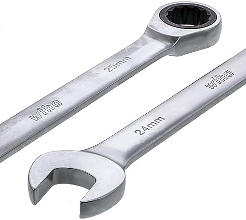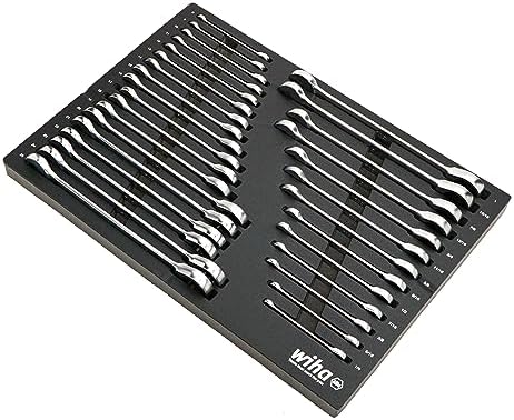 Set Includes - Inch 1/4, 5/16, 3/8, 7/16, 1/2, 9/16, 5/8, 11/16, 3/4, 13/16, 7/8, 15/16, 1” | Metric 8, 9, 10, 11, 12, 13, 14, 15, 16, 17, 18, 19, 20, 21, 22, 23, 24, 25mmItems In SetWiha 30301 - Combination Ratchet Wrench 20mm (OAL ″)Wiha 30302 - Combination Ratchet Wrench 21mm (OAL ″)Wiha 30303 - Combination Ratchet Wrench 22mm (OAL ″)Wiha 30304 - Combination Ratchet Wrench 23mm (OAL ″)Wiha 30305 - Combination Ratchet Wrench 24mm (OAL ″)Wiha 30306 - Combination Ratchet Wrench 25mm (OAL ″)Wiha 30308 - Combination Ratchet Wrench 8mm (OAL ″)Wiha 30309 - Combination Ratchet Wrench 9mm (OAL ″)Wiha 30310 - Combination Ratchet Wrench 10mm (OAL ″)Wiha 30311 - Combination Ratchet Wrench 11mm (OAL ″)Wiha 30312 - Combination Ratchet Wrench 12mm (OAL ″)Wiha 30313 - Combination Ratchet Wrench 13mm (OAL ″)Wiha 30314 - Combination Ratchet Wrench 14mm (OAL ″)Wiha 30315 - Combination Ratchet Wrench 15mm (OAL ″)Wiha 30316 - Combination Ratchet Wrench 16mm (OAL ″)Wiha 30317 - Combination Ratchet Wrench 17mm (OAL ″)Wiha 30318 - Combination Ratchet Wrench 18mm (OAL ″)Wiha 30319 - Combination Ratchet Wrench 19mm (OAL ″)Wiha 30322 - Combination Ratchet Wrench 1/4" (OAL ″)Wiha 30323 - Combination Ratchet Wrench 5/16" (OAL ″)Wiha 30325 - Combination Ratchet Wrench 3/8" (OAL ″)Wiha 30327 - Combination Ratchet Wrench 7/16" (OAL ″)Wiha 30329 - Combination Ratchet Wrench 1/2" (OAL ″)Wiha 30331 - Combination Ratchet Wrench 9/16" (OAL ″)Wiha 30333 - Combination Ratchet Wrench 5/8" (OAL ″)Wiha 30334 - Combination Ratchet Wrench 11/16" (OAL ″)Wiha 30335 - Combination Ratchet Wrench 3/4" (OAL ″)Wiha 30336 - Combination Ratchet Wrench 13/16" (OAL ″)Wiha 30337 - Combination Ratchet Wrench 7/8" (OAL ″)Wiha 30338 - Combination Ratchet Wrench 15/16" (OAL ″)Wiha 30339 - Combination Ratchet Wrench 1.0" (OAL ″)Wiha 93046 - EMPTY FOAM TRAY FOR FOR RATCH/COMBO WRENCHES (OAL ″)More Details Wiha's Combination Wrenches have a 12-point box-end design with contact points that apply force to the flat sides of the fastener head—rather than the corners—to prevent the fastener head from rounding off. The open-end is angled 15 degrees for flipping the wrench between rotations to maximize rotations and the box-end offset 15 degrees for finger clearance and working around obstructions that limit access to the fastener. The wrenches consist of premium-quality tool steel, have a Chrome-plated satin finish for corrosion protection, and the size profiles are boldly stamped on the handle for easy identification. The tools come conveniently stored in a soft modular foam tray for secure, space-saving storage. The foam tray is designed with high visibility tool callouts printed on each tray to easily return tool to its location. Wiha modular foam trays are made of durable laminated tri-layer foam and will fit in most toolboxes and pull out tool drawers. Wiha modular foam tray are the perfect solution for any storage or organization needs. Wiha Combination Wrench Tray Sets are designed and engineered by Wiha Germany. Open end angled 15 degrees for quick and easy flipping between rotations12 Point Box End is offset 15° for versatile fastener fitment72 tooth ratchet system with 5° arc swing for smooth ratcheting in tight spacesHighly dependable pawl mechanism for slip and skip preventionWiha premium-quality tool steel for strength and durabilityChrome-plated satin finish for corrosion protectionDesigned and engineered by Wiha Germany