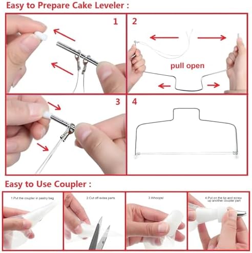- 【Cake Leveler and 2 Spatulas】: The cake leveler can level cakes into even layers for creating professional-looking layer cakes. Straight spatula for icing round cakes from Sides,angled spatula from Top while rotating turntable.