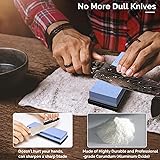 【Complete Knife Sharpening Stone Kit】You don't need to be a Pro to sharpen your blades, all you need is the right tools & technique. All the sharpening tools you need are here, one affordable set for you: 400/1000 & 3000/8000 grit whetstone; Coarse flattening stone; Non-Slip Bamboo base; Knife sharpening angle guide; Leather strop, a simple instruction manual about how to use and what does every component do. 【Dual Sided Whetstone】Our wet stone is made of highly durable and professional-grade corundum which is aluminum oxide. 400/1000 grit whetstone to sharpen dull knives, 3000/8000 grit whetstone combination is designed to make your knives razor-sharp & provide extra fine finish/polish on your blades. Coarse flattening stone to keep your whetstone flat all the time. Using the leather strop made of genuine cowhide leather to polish knife and removing burr after sharpening. 【Multipurpose】Our professional-grade knife sharpener kit is highly durable & long-lasting. Please choose the appropriate grit stone according to your knife blade. Our whetstone sharpens any blade out there: any kitchen knife set, chef knife, steak knife, santoku knife, paring knife, sushi knife, cleaver knife, Henckels knives, kitchen knives, Japanese knife, butcher knife, paring knife, BBQ knife, Hunting Knife, Pocket Knife, Scissor, straight razors!