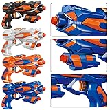 Package Includes: 4 Pack blaster guns with 80 pcs soft foam bullet darts. Blaster Guns Dimension:7.5*4.6 inch, suitable for children over 6 years old, 3-6 years old need to operate under the supervision of an adult, Adults also can play. Blaster Guns: Made of high quality ABS plastic. Solid And Durable,Speed And Mobility - Easier to reload the darts; No jamming issue, easy to carry with light weight; Fire darts up to 40 feet. 80 Pcs Refill Darts: 40 Pcs darts can be attached to the smooth surface and 40Pcs Regular foam bullets For 2 teams to use, Refill darts are soft foam, safe for young kids. Use: Great gift for Birthday, Children's Day, Christmas Day and New Year. Will bring boys much fun. Customers First: If you are confused with your order, you can contact us and point the problem to urge us to right it, so that we can handle your problem asap.