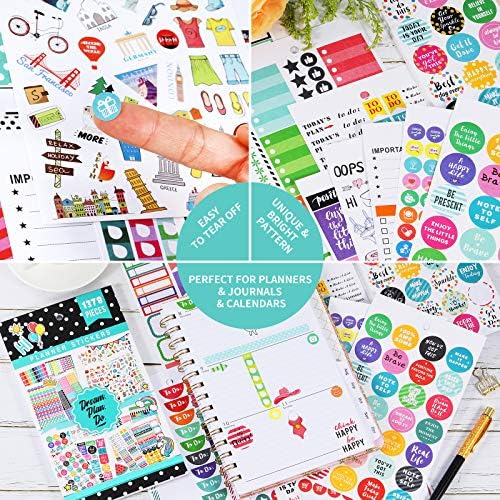 • PAQUETE DE ADHESIVOS PARA PLANIFICADOR - ¡1378 ADHESIVOS!!! El set de adhesivos para planificador incluye más de 1,000 adhesivos con varios temas. Hay un total de 28 hojas de adhesivos en un set. Varios temas incluyen 3 hojas para adhesivos de actividades divertidas y relajación, 5 hojas para estilo de vida saludable, viajes y adhesivos de vacaciones, 4 hojas para citas inspiradoras y 16 hojas para recordar, planificar, decorar y mucho más.