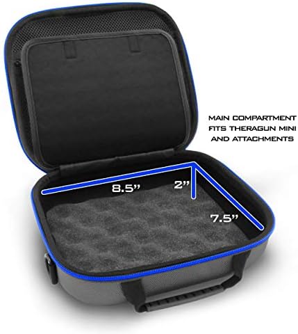 CASEMATIX Mini Massager Travel Case Compatible with Theragun Mini - Hard Shell Carrier with Shoulder Strap and Accessory StorageHard Shell Protection for your MassagerThis carry case allows you to securely store and house your massager, multiple head attachments, charger and other accessories. It is constructed from durable EVA material that offers protection from scrapes, splashes, drops and impacts. Double-stitched, reinforced zippers hold the case together securely. The interior features a padded divider with a zippered top area to hold accessories.Travel-Friendly, Stylish DesignThe case’s portable and discreet design makes it ideal to transport and store your massager and accessories. A premium nylon adjustable shoulder strap is also included and can be removed in seconds using the metal easy-clip hardware. The case measures 9.5" x 8" x 4" so it can be conveniently kept by your side, taken to a friend’s house, the gym, or stored for use later.Padded Internal ProtectionThis case features non-scratch fabric materials and a padded middle divider to protect from impacts. The bottom compartment fits your massager and attachments, and the top netted pouch can hold accessories like your charger, extra attachments and more. The main compartment measures 8.5” x 7.5” x 2”.To ensure a perfect fit, double-check your accessory dimensions against internal dimensions 8.5” x 7.5” x 2”
