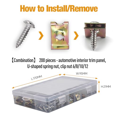 - 3.【Practical Accessory】 Contains 200 U-shaped clips and screws(100pcs U‑clips & 100pcs screws), covering a variety of specifications (such as M3, M4, M5, etc.), which can meet your different needs in repairing cars, motorcycles, etc., and is a very practical car owner accessory.
