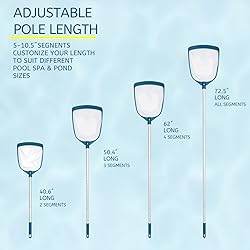 Adjustable 3/4" diameter aluminum pole with skimmer length from 1.3 ft to 5 ft, Integrated the aluminum pole with skimmer,removing leaves, bugs, sticks, and other garden debris from the surface of your pool POOLWHALE pool skimmer with pole made from aluminum and rugged plastic, this space-saving cleaning tool is essential for smaller above ground pools or quick spot skimming any size pool, Wider front edge to avoid the rubbish escape, higher frame of the skimmer for better performance Heavy duty lightweight plastic molded frame is safe for use in all types of pools and it won't mar pool liners. Fine mesh pool skimmer net grab tiny debris from the swimming pool bottom and surface. The pool skimmer collects all leaves and debris to prevent dirt from entering your filter system, allowing better water flow and longer filter cycles 【Multifunction】 Easily Scoops out leaves, insects and other kinds of floating debris from your Swimming Pool, In-ground and above ground Pool. This beautiful Pool leaf rake net can also be used to clean hot tub, Spa and Pool fountain, Pools for Kids and Adults. This Pool net for cleaning helps you keep your Swimming Pool neat and clean Buy our Pool Accessories with confidence, as our premium quality Pool leaf skimmer is built to last, and if you're not satisfied with our Pool Cleaner at any time within 60 days of purchase, we'll provide a refund or replacement