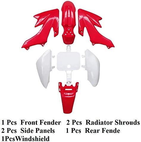 - 7 PCs Complete kit includes,crf50 plastics kit : CRF50 style fenders, tank shrouds and number plate--1 Pcs Front Fender + 2 Pcs Radiator Shrouds + 2 Pcs Side Panels + 1 Pcs Rear Fende + 1PcsWindshield.