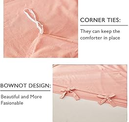 100% Washed Cotton 【Material】100% Washed Cotton. ultra soft, comfortable, breathable, and durable. 【Bedding Set 3pcs】 Include:1 Twin XL Size Duvet Cover: 69"×92", 2 Standard Pillowcases: 20" x 30". 【Note】 Please kindly note this bedding set DOESN'T include any comforter or filling. This Set dosen't include any flat sheets 【Design】You can use it on the bedroom, guest room, school dormitory, hotel... 100% Washed cotton bedding set Pink bow decorative design.Paired with ruffled pillowcase made of the same material. It's a great gift idea for women friends, girls, Moms, Valentine's - Mother's - Day and Christmas. 【Instructions】Machine wash in cold and tumble dry on low. No long time soaking. No dry clean recommended. Envelope closure pillow case(Pillowshams). The Zipper Closure is easy for you to put your comforter in and out and 4 corner ties to help hold your comforter in place ensuring greater sleep experience.