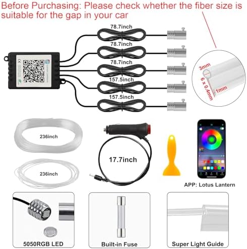 Luces de Tira LED para Interior de Coche, Control por APP, Kit de Iluminación Ambiental RGB de 16 Millones de Colores 5 en 1 con Fibra Óptica de 236 pulgadas, Decoraciones de Iluminación Interior con Modo de Música