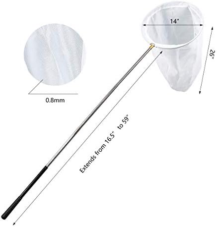RestCloud Professional quality bug catching net is designed for kids, adults and insects collectors. Please add this butterfly net to your shopping cart without any hesitation. Features: - Tiny holes in the mesh for small to large sized insects, they cannot out of the net. - 14 Stainless inches net ring for collection; - 26 inches net depth for avoiding butterflies and insects flying out; - Stainless Telescoping pole extends from 16.5 inches to 59 inches. The Butterfly net Full Extended is 73 inches; - Twist to left to release, twist to right to lock it. Anti-slip handle grip made; - Locking mechanism makes it stay extended and lockable; - Long, but folds up and collapses nicely, wide to fit in any pack. Quality Martials - This Bug collection kit for kids is made of Stainless, including ring, connection and handle, which makes it solid and durable. - The mesh is made of Polyester, the hole is very tiny. It can be used in bushes and trees. - The handle is crew on the ring with a rivet for sturdy, which makes it controllably. Before using it, please twist it tightly. Wide application - This extendable bug catching net is great for different butterfly, dragonfly, bat, fish and other bugs. And anything else that catches your eye, Nets for insect specimen capture. - This tiny holes bug catching net is special design for small to large sized insects. They cannot out of the net. - The 26 inches net depth is design for various kinds of flying insects, such as butterfly, ladybird, dragonfly, moth, etc. It can avoid them flying out efficiently. - Long and sturdy. It can be used to pick up fruit from tree. Package Includes: 1 x Professional Insect and Butterfly Net