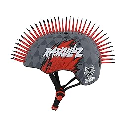 - Shake it up with the Raskullz Red Jolt child helmet! This 3D mohawk helmet features an eye catching bendable red mohawk with black tips and some radical printed graphics. The grey matte/gloss helmet makes the Raskullz graphic pop right at you! Recommended for ages 5-8 with heads measuring 50-54 cm.