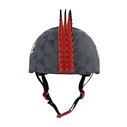 DESIGN - Kids love the red bendable 3D rubber mohawk w/ black tips and radical printed graphics. STYLE- Perfect light weight helmet for your little rad ripper to use while riding a bike, scooter, skateboard or rollerblades. SPECIFICATION - Recommended for ages 5-8 years but will fit anyone with a head measuring 50cm-54cm. Always take a head measurement. Head sizes and shapes can vary, even within an age range. Using a helmet that does not fit can be dangerous. COMPLIANCE - Complies with the U.S. CPSC Safety Standard for Bicycle Helmets for Persons Age 5 and Older. Also complies with U.S. ASTM Safety Standard for multi-impact Skateboard Helmets. CONSTRUCTION- Adjustable straps for a custom snug fit, and aerodynamic cooling vents for great airflow. Durable outer PVC shell, and impact dampening expanded polystyrene inner foam construction. Sport type: Cycling Fit type: Universal Fit