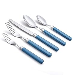 Complete 20-Piece Flatware Set for 4 – Includes 4 dinner forks, 4 salad forks, 4 dinner knives, 4 dinner spoons, and 4 dessert spoons. Dimensions (Height)- Salad Fork: 6 3/4” (17cm), Dinner Fork: 9” (22.5 cm), Table Knife: 8” (20 cm), Tablespoon: 8” (20 cm), Teaspoon: 6 3/4“ (17 cm) Colorful Plastic Handles – Modern, vibrant, and colorful handles add a playful yet elegant touch to your table setting, perfect for brightening up everyday dining or themed gatherings. Comfortable & Functional Design – Balanced weight and smooth rounded edges make each piece easy to hold while ensuring reliable performance for casual or formal dining. Ergonomic handles with a smooth finish make mealtime comfortable and enjoyable. Premium 18/0 Stainless Steel – Crafted from high-quality, food-grade stainless steel with extra thickness for lasting durability, a comfortable hand feel, and a luxurious dining experience. Mirror-Polished Finish – Each piece is carefully polished to a high shine, creating a sleek, reflective surface that adds elegance to formal dining while staying resistant to stains and easy to clean. Dishwasher Safe & Easy Care – Designed for convenience, this flatware set is easy to clean and maintain without losing its color or shine. Perfect for Every Occasion – This elegant and durable flatware set makes a thoughtful choice for weddings, housewarmings, road trips, camping, RVs, birthdays, anniversaries, or holiday gifts, such as Christmas, Mother’s Day, and Thanksgiving.