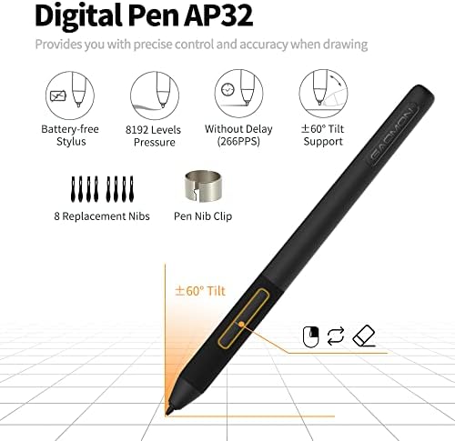 - [Lápiz sin batería AP32] No requiere baterías ni carga, puede crear cuando lo desee, conveniente para ambos y el medio ambiente. [8 reemplazos de puntas] Hay 8 puntas de lápiz adicionales para que las reemplaces. [1 año de garantía] GAOMON ofrece una garantía de un año y soporte técnico de por vida para todas nuestras pen tablets y pen displays