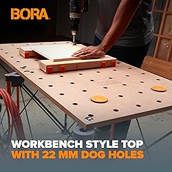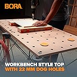 Ultimate Workstation: Transform any Bora Centipede work stand into a professional-grade portable workbench; Supports up to 2000 lbs; Perfect for job sites, home projects, and woodworking tasks requiring a stable surface Premium Construction: Durable wood table top features hinged center design for easy transport; Built with precision 20mm dog holes spaced 96mm on center; Compatible with all standard MFT table accessories and clamps Versatile Application: Ideal for both Bora tool enthusiasts and professional contractors; Create a centipede work table instantly; Perfect companion for your existing Bora clamps and Bora Centipede accessories Easy Portability: Innovative folding design makes storage and transportation effortless; Integrated carrying slot allows one-handed transport; Quick setup and teardown for mobile workshops and temporary work areas Complete Package: Includes one 24" x 48" Bora table top with MFT-compatible dog hole pattern and six quick-twist lock handles; Provides your Bora Centipede 2x4 or 4x8 stands with professional workbench tops